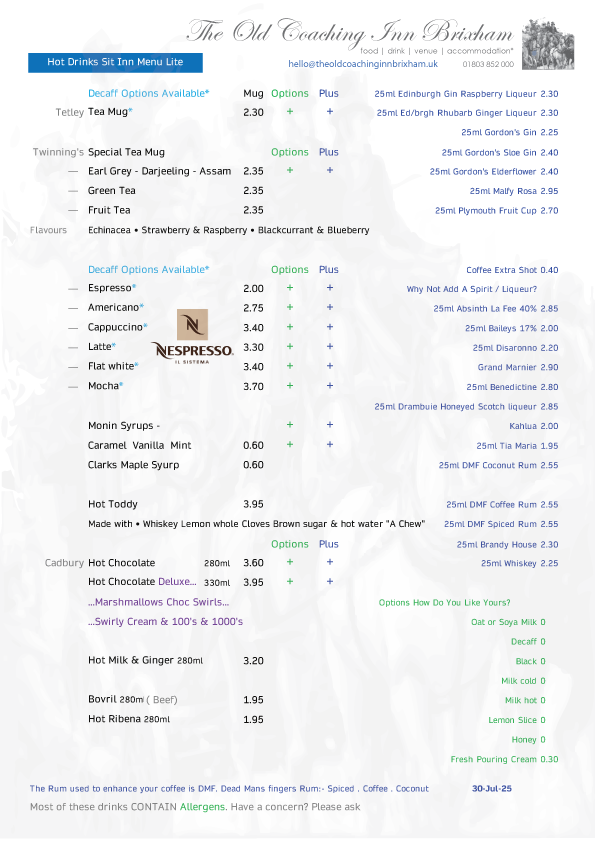Hot Drinks Menu At The Old Coaching Inn Brixham... serving everything for Cappuccino, Latte's, Macha's etc